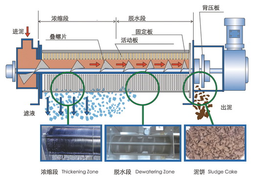 污泥在濃縮部經(jīng)過重力濃縮后,被運輸?shù)矫撍浚谇斑M的過程中隨著濾縫及螺距的逐漸變小,以及背壓板的阻擋作用下,產(chǎn)生內(nèi)壓,容積不斷縮小,達到充分脫水的目的。